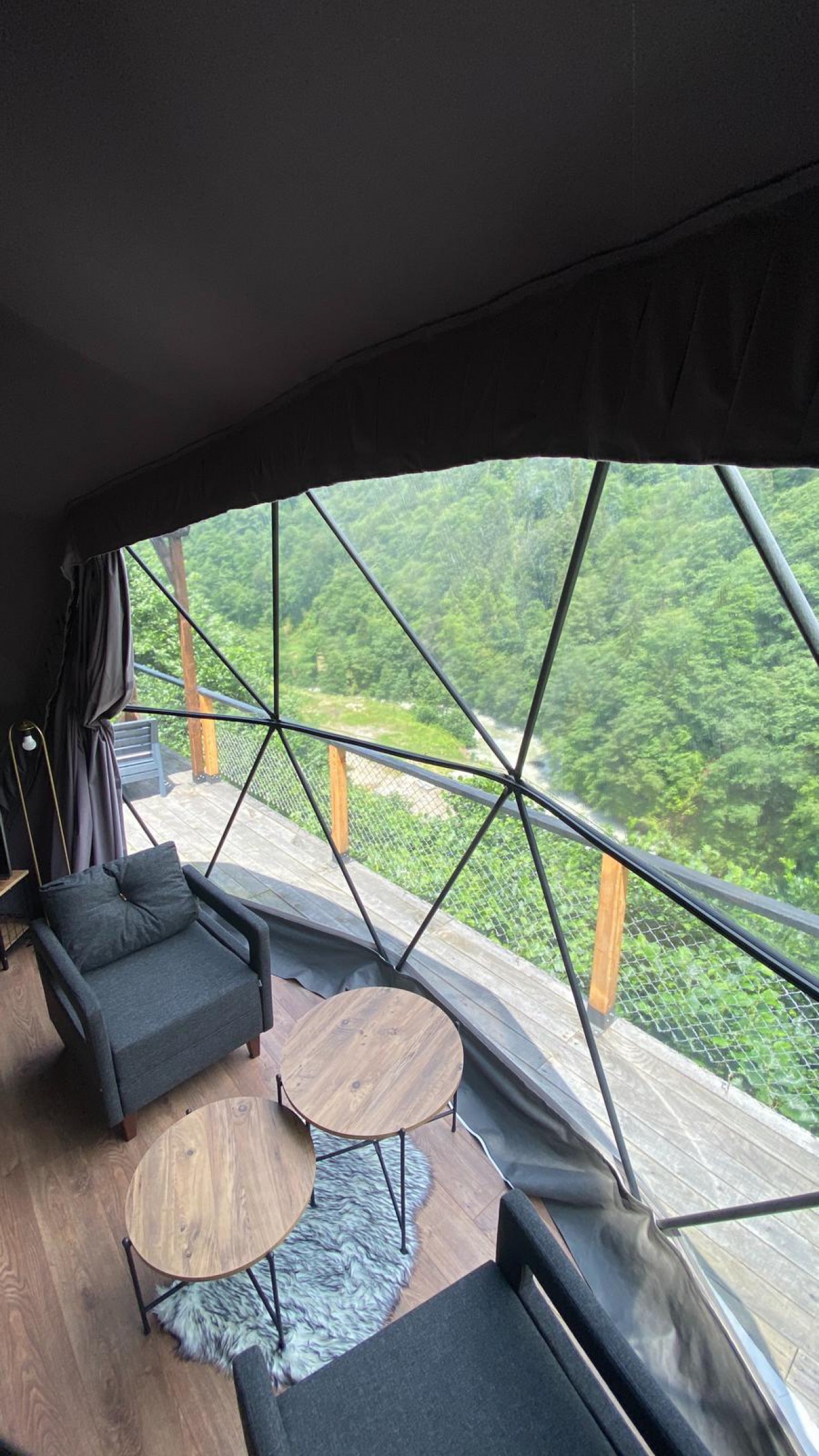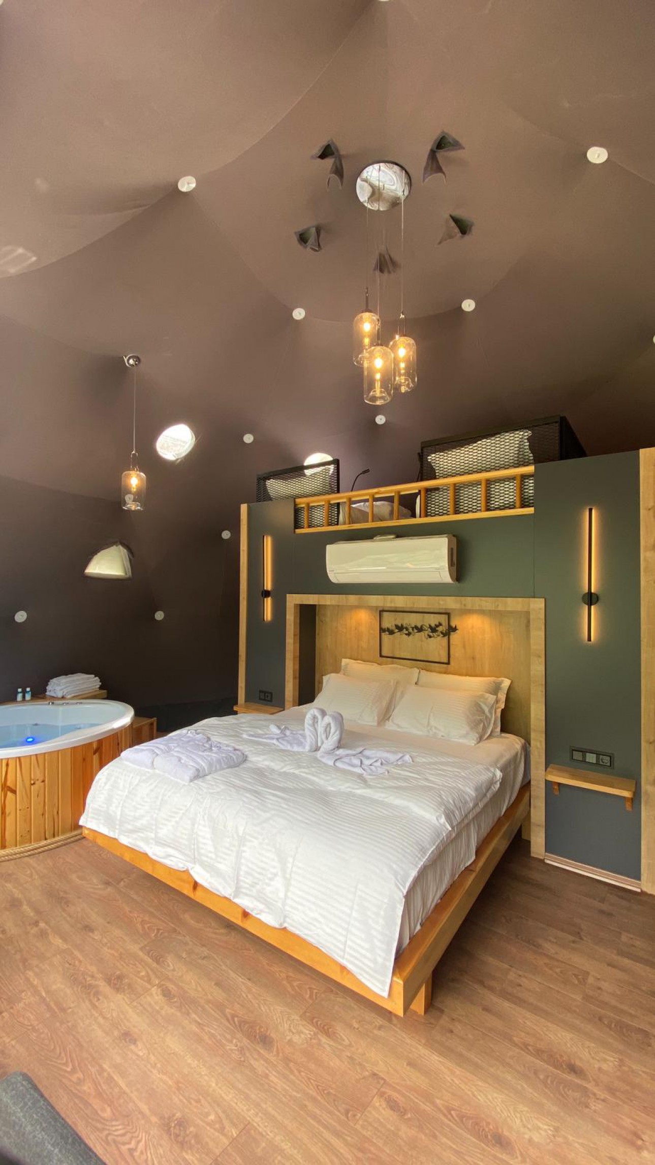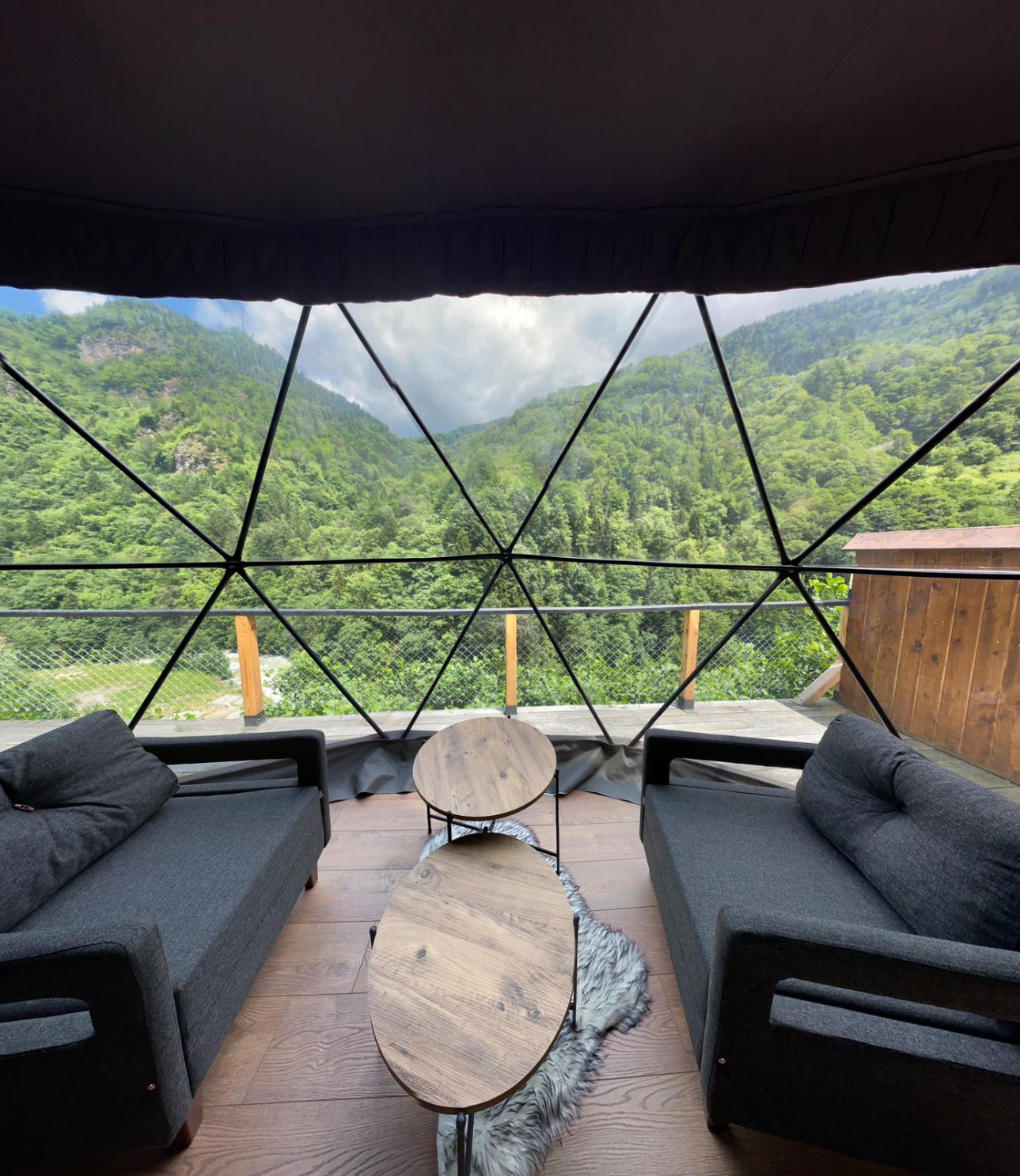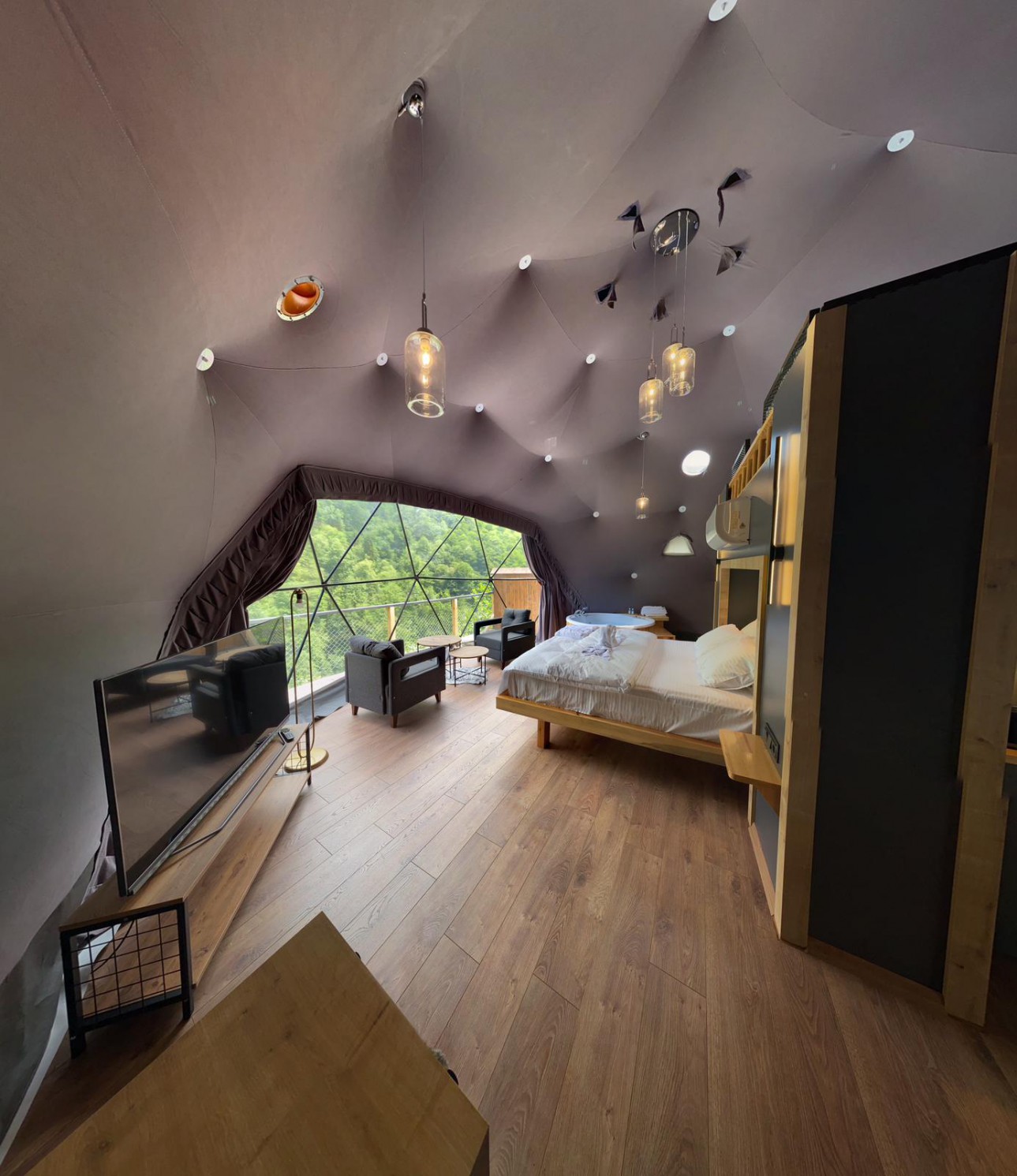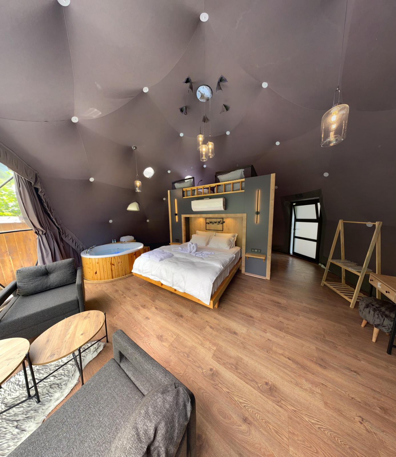 45 m2 genişliğinde olan kubbemiz doğa ile uyumlu,modern bir tarza sahiptir.Dere ve vadi manzaralı panoramik pencereye sahip olan odamızda bir adet çift kişilik king yatak,asma katında ise 2 adet tek kişilik yatak mecuttur.Ayrıca oda içerisinde jakuzi bölümü bulunmaktadır.Panoramik pencere önünde ise keyifli sohbetler gerçekleştirebileceğiniz bir oturma alanımız vardır.Kubbemiz unutulmaz bir doğa deneyimi için geniş bir teras alanına sahiptir.Bu alanlarda çay ve kahvenizi hazırlayıp yudumlayabilmek için özel olarak tasarlanmış mini bir mutfağımız bulunmaktadır.Kubbemizde klima mevcuttur.Fiyatlarımıza kahvaltı dahildir,serpme kahvaltı şeklinde restaurant bölümümüzde servis edilmektedir.Kahvaltımıza yöresel ürünlerle hazırlanmış muhlama ve diğer sıcak ikramlarımız dahildir.Oda içerisinde içeceklerimiz ücretsizdir.