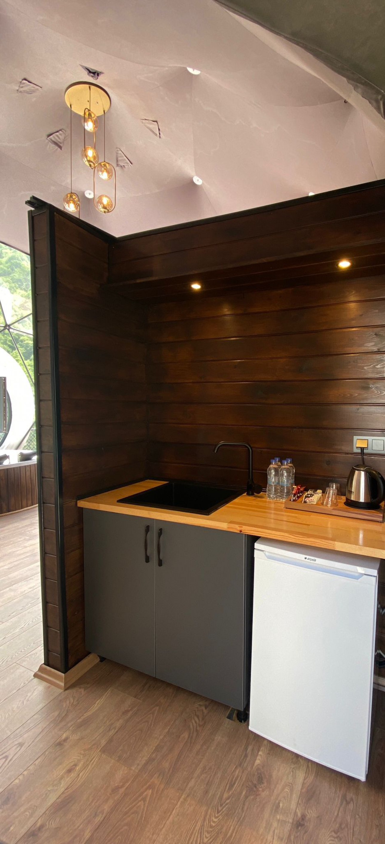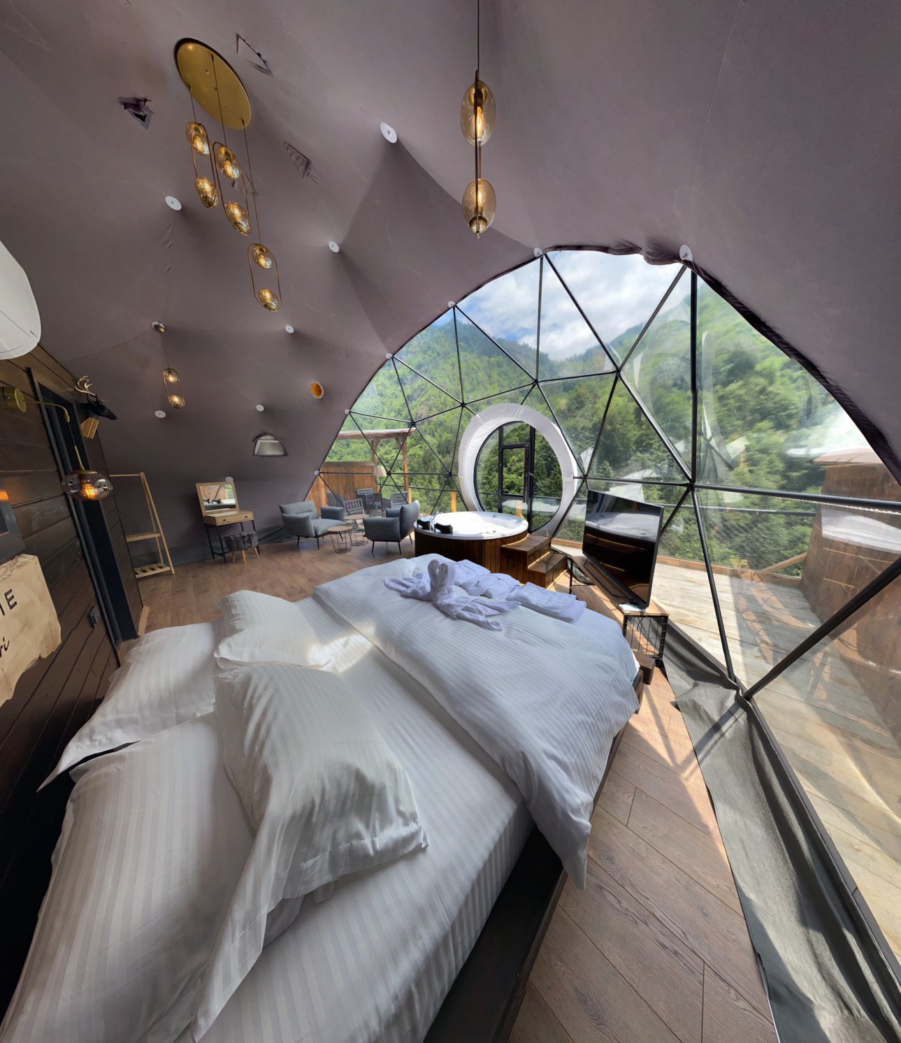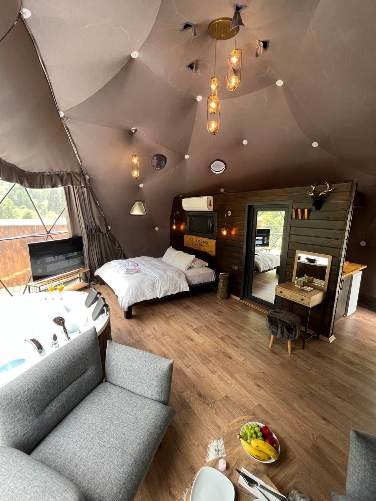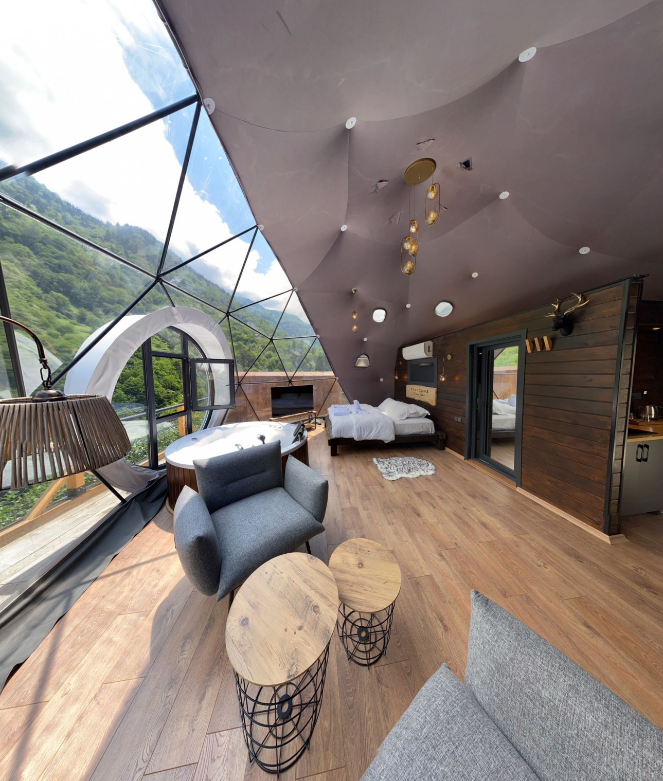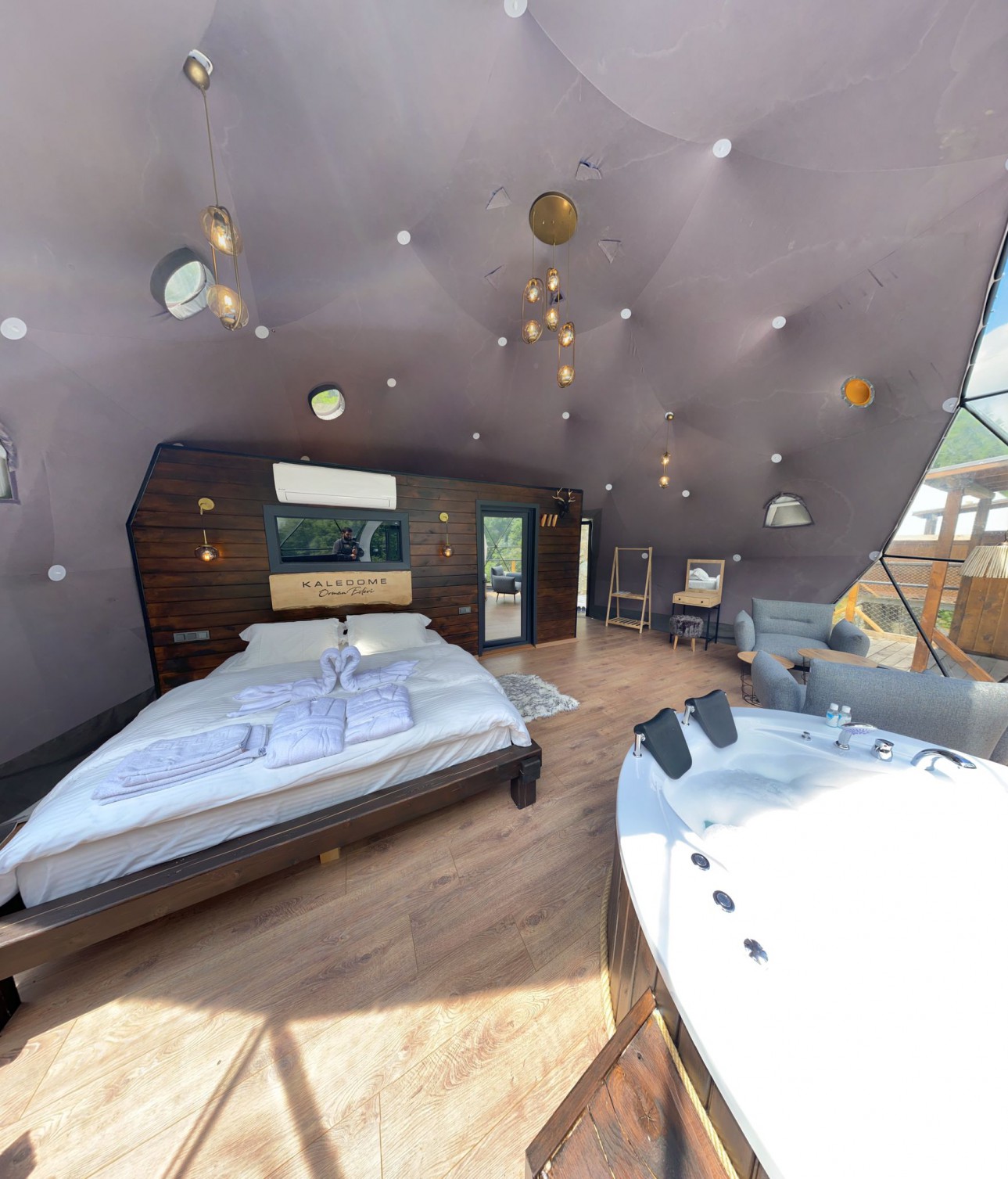 50 m2 genişliğinde olan Suit kubbemiz dere ve vadi manzarasına sahiptir.Bir adet çift kişilik King yatak bulunmaktadır.İç dizaynı çiftlerimiz için özel olarak tasarlanmıştır.Geniş banyo bölümünde bir adet oda içine bakan pencere mevcuttur.Oda içerisindeki jakuzimiz panoramik pencere önünde yer almaktadır.Yatak başlığımız özel kütüklerden hazırlanmıştır.Kubbemiz unutulmaz bir doğa deneyimi için geniş bir teras alanına sahiptir.Bu alanda çay ve kahvenizi hazırlayıp yudumlayabilmek için özel olarak tasarlanmış mini bir mutfağımız bulunmaktadır.Kubbemizde klima mecuttur.Fiyatlarımıza kahaltı dahildir.Serpme kahvaltı şeklinde restaurant bölümümüzde servis edilmektedir.Kahvaltımıza yöresel ürünlerle hazırlanmış muhlama ve diğer sıcak ikramlarımız dahildir.Oda içerisindeki içeceklerimiz üretsizdir.